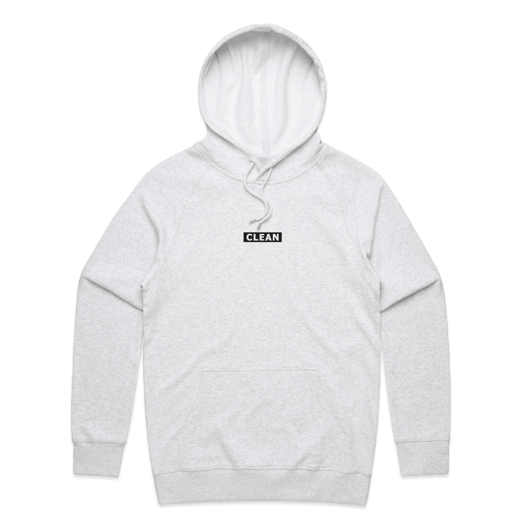 Heathered midweight terry hoodie with reverse iconic CLEAN logo.
