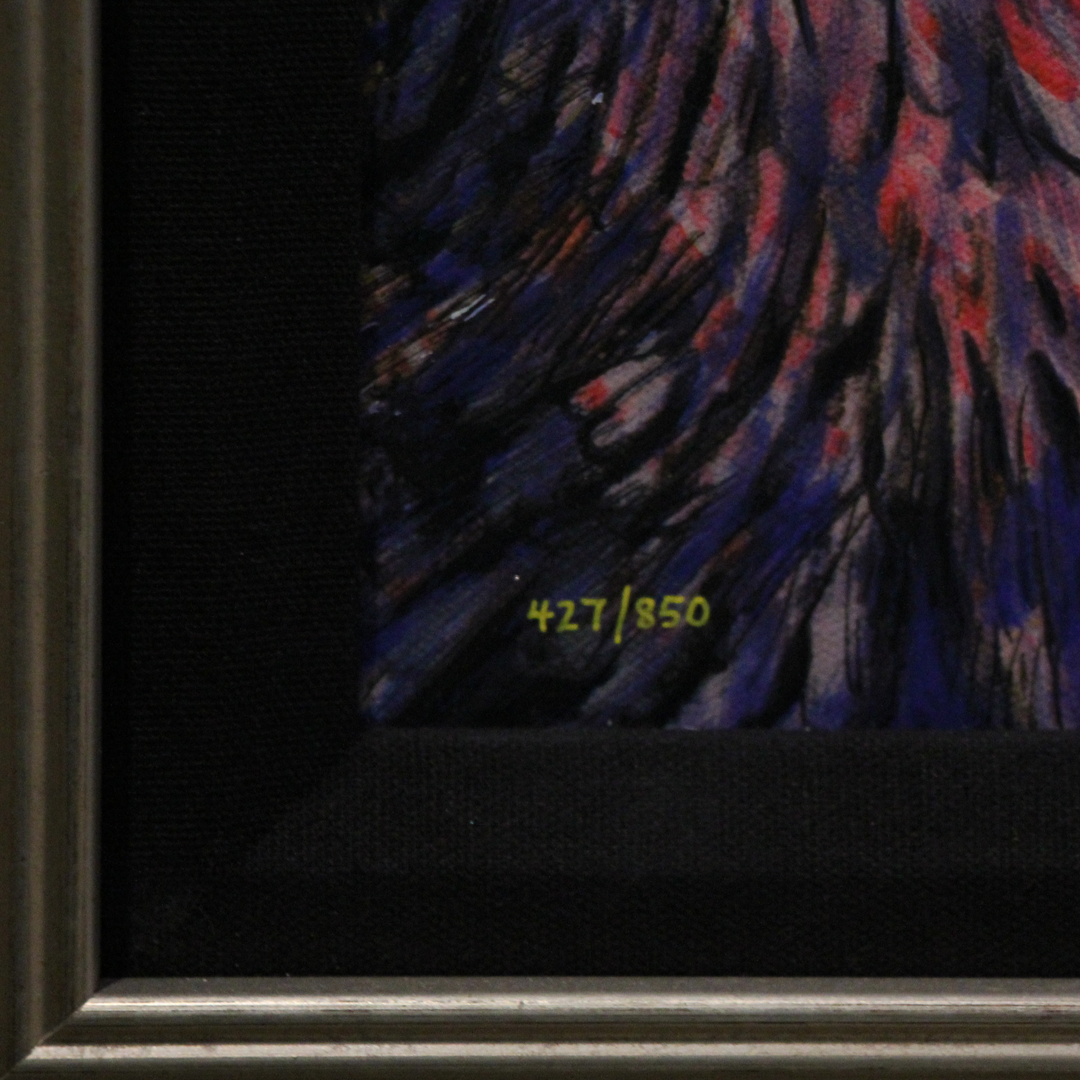 Limited edition hand-pulled serigraph printed using 25 individual silkscreens, taking 3 months to complete. Certificate of authenticity included. Print measures 16x12 and frame measures 16x20. Price includes frame.